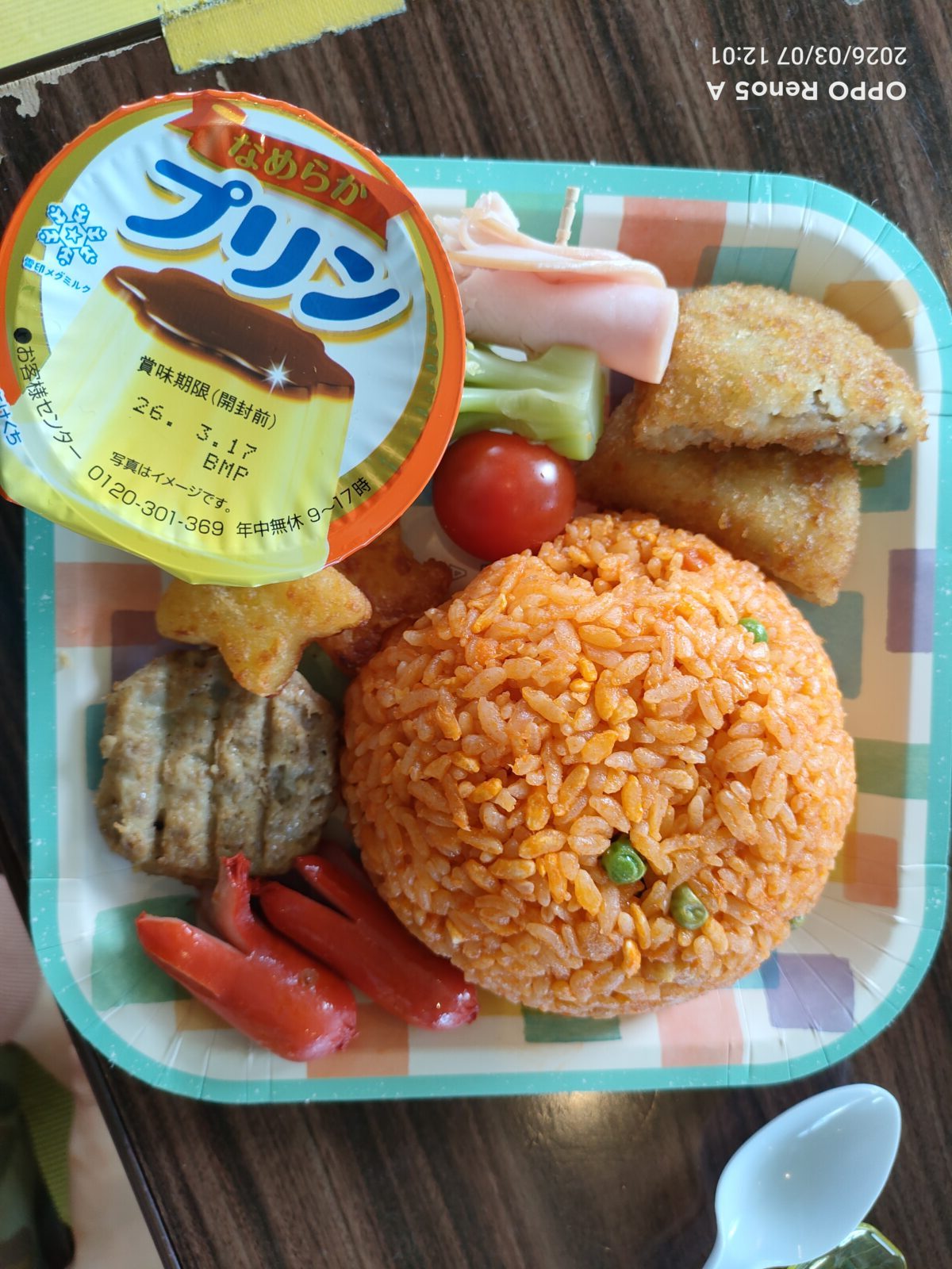 チキンライス、タコさんウィンナー、ハンバーグ、ポテト、サラダ、コロッケ、プリンです(*‘∀‘)