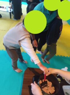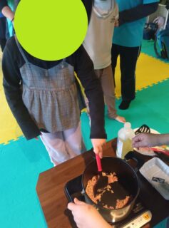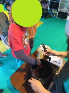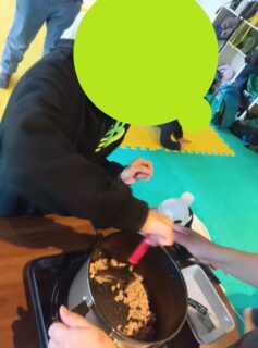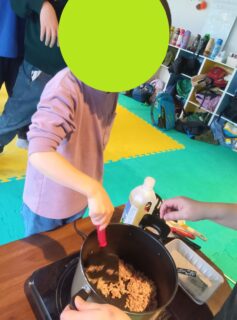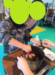 みんなで順番にまぜまぜ♪火が通ったらお子様達が切った野菜を鍋に入れて煮込みます!