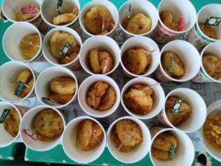 順番に並んでお菓子をとります!飾りつけのベルやリボン、モールもとって紙皿にいれます!