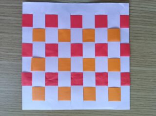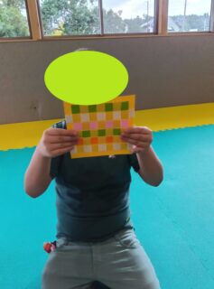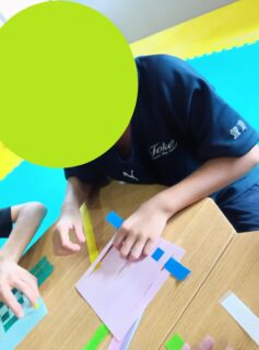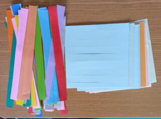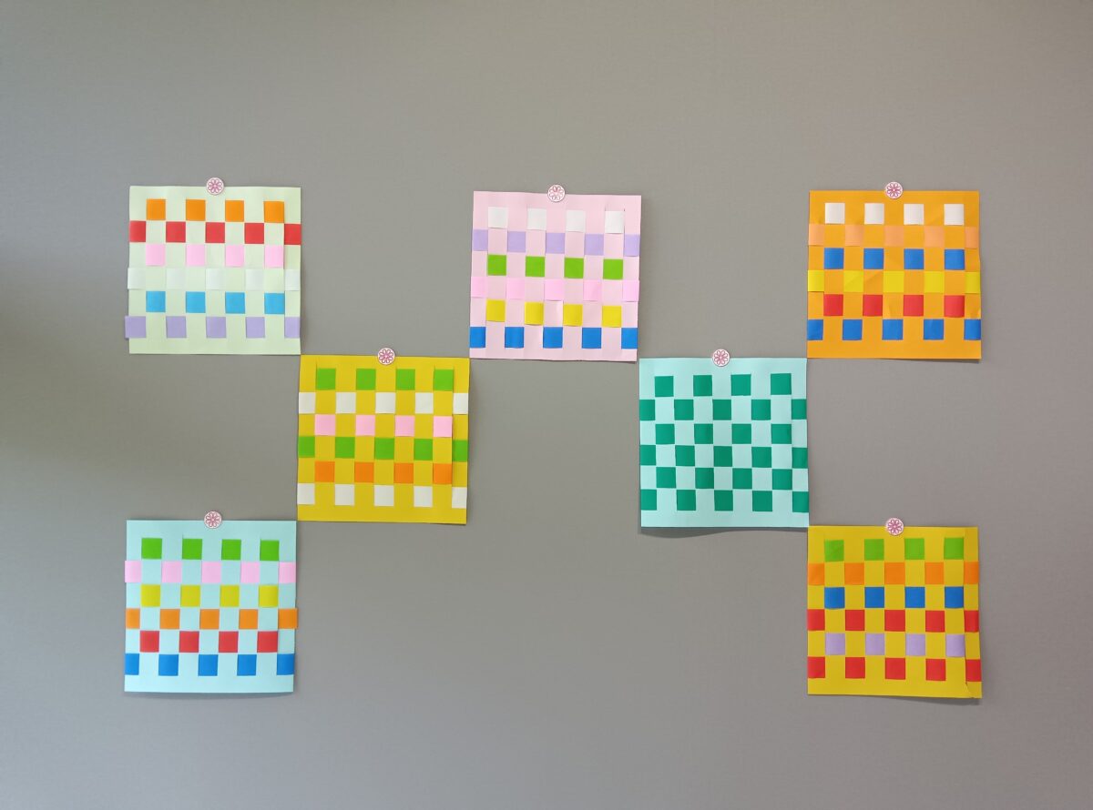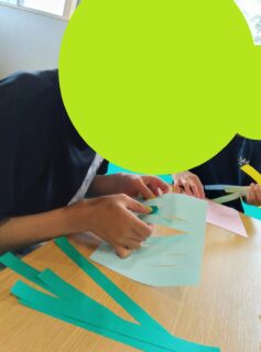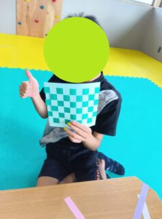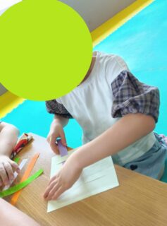 長く切られた折り紙の中から好きな色を6枚選んで、土台となる画用紙に交互に出し入れしていきます(^^)/