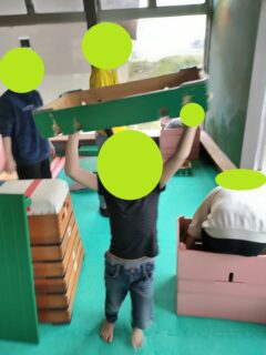 運動用具を外に出す作業を小学生以上のお兄さんたち、